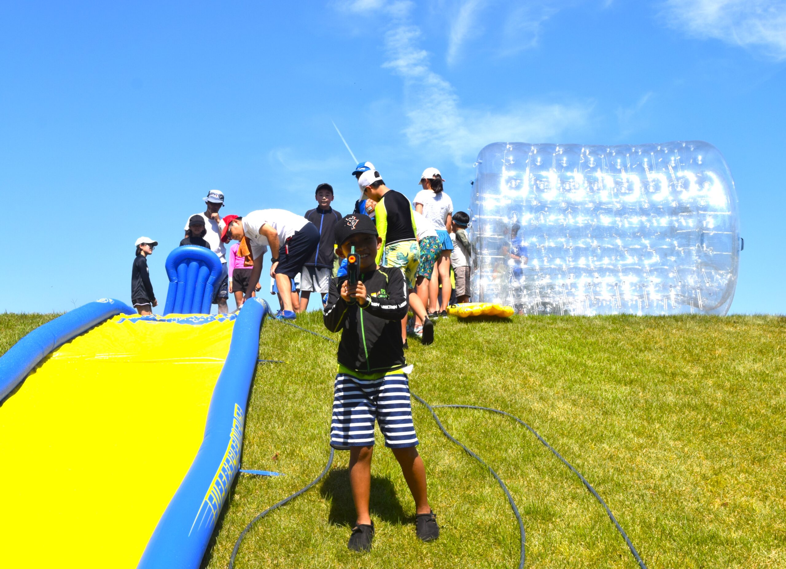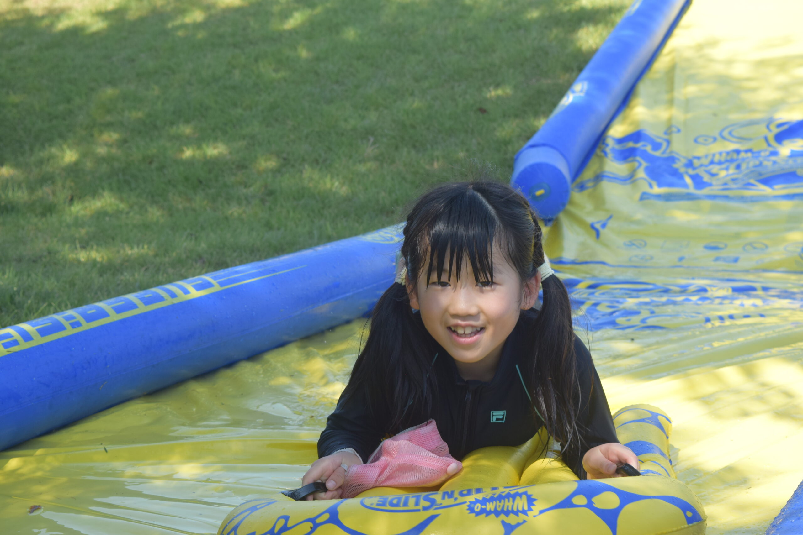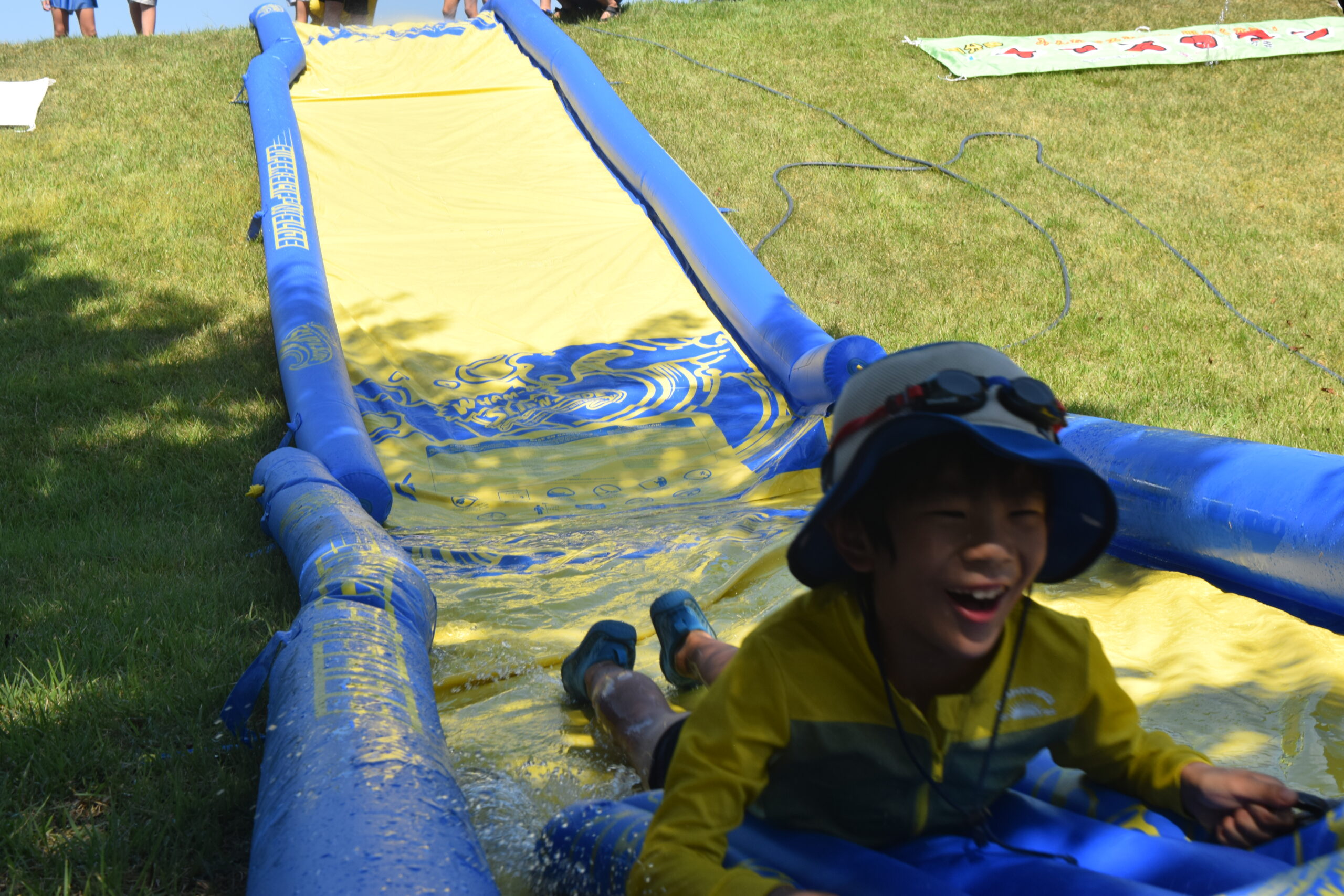 午後はウォータースライダーに水鉄砲、ウォーターバルーンを使い思い切り遊んでいました。晴天にめぐまれたので、気温がぐんぐん上がり熱中症を心配しましたが、こまめな水分補給を呼び掛ける対策を行い、なんとか無事にキャンプができました。